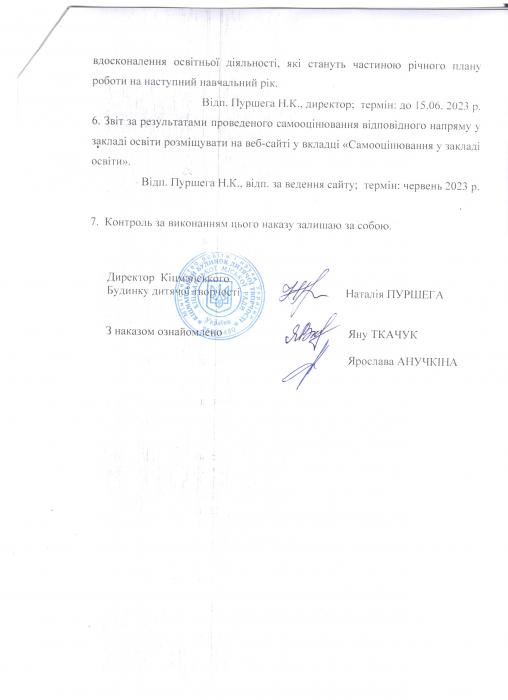 Наказ про проведення самооцінювання за напрямом "Освітнє середовище закладу позашкільної освіти" в 2022-2023н.р.